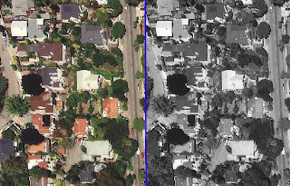 Figure 2: Comparison of black and white and color images of the same scene. Note how the increased number of tones found on the color image make the scene much easier to interpret. (Source: University of California at Berkley - Earth Sciences and Map Library).